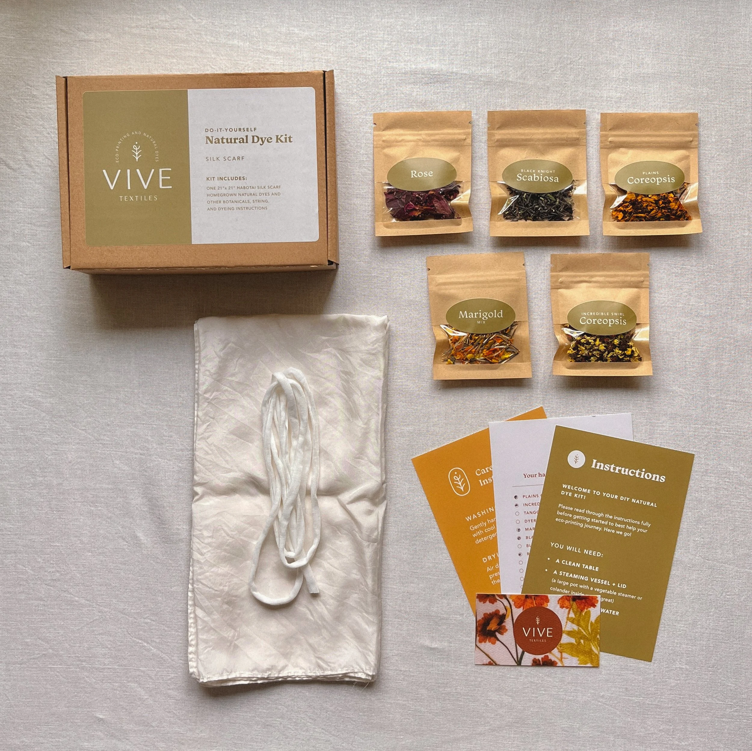 Add the included flowers. The white sheet will tell you what colors the flowers will make. You are encouraged to use your own local foliage, flowers from your yard, turmeric (lightly) and onion skins from your pantry! The more dyes, the more colorful your results will be.